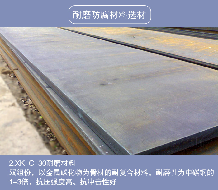 雙組份,以金屬碳化物為骨材的耐復合材料,耐磨性為中碳鋼的1-3倍,抗壓強度高、抗沖擊性好。用于3mm以下粒度過流部件修復及大面積預途。如浮選槽、攪拌桶,葉片等。