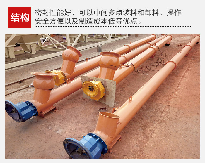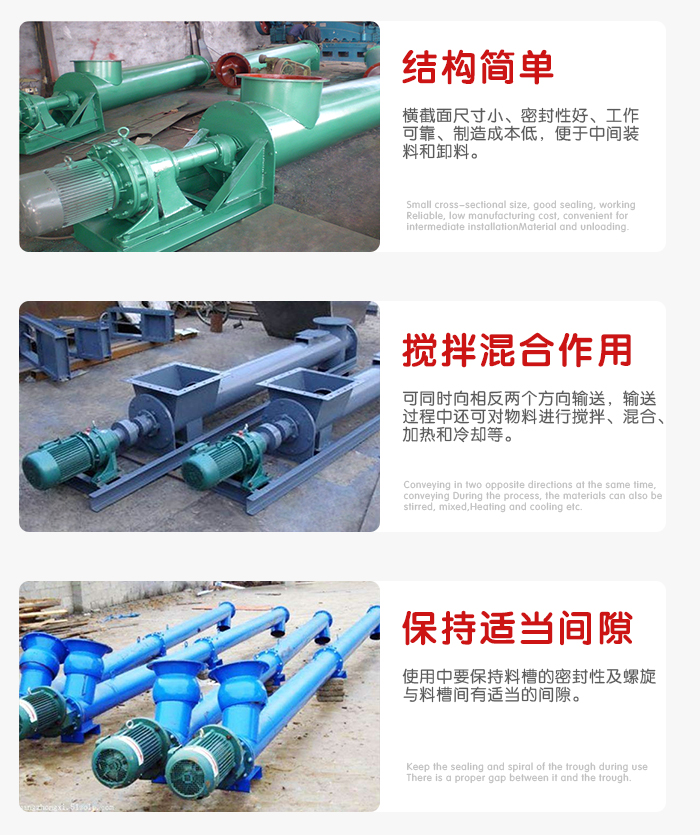 結(jié)構(gòu)簡單、橫截面尺寸小、密封性好、工作可靠、制造成本低,便于中間裝料和卸料,輸送方向可逆向,也可同時(shí)向相反兩個(gè)方向輸送。輸送過程中還可對物料進(jìn)行攪拌、混合、加熱和冷卻等作業(yè)。通過裝卸閘門可調(diào)節(jié)物料流量。但不宜輸送易變質(zhì)的、粘性大的、易結(jié)塊的及大塊的物料。輸送過程中物料易破碎,螺旋及料槽易磨損。單位功率較大。使用中要保持料槽的密封性及螺旋與料槽間有適當(dāng)?shù)拈g隙。