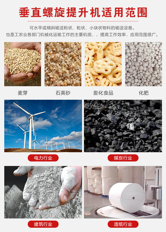 螺旋垂直提升機(jī)是用來水平或傾斜輸送粉狀、粒狀、小塊狀物料的一般用途的輸送設(shè)備, 螺旋輸送給料機(jī)是工農(nóng)業(yè)各部門機(jī)械化運(yùn)輸工作的主要機(jī)組,可使運(yùn)輸工作減輕勞動(dòng)強(qiáng)度,提高工作效率,應(yīng)用范圍很廣。
