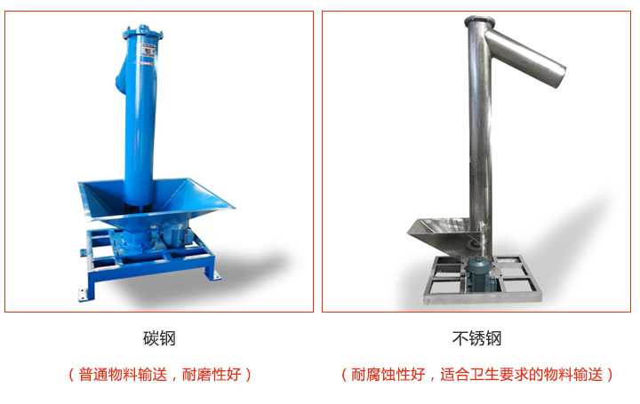 垂直螺旋輸送機材質(zhì)有碳鋼和不銹鋼兩類,碳鋼適合普通物料輸送,耐磨性好;不銹鋼適合醫(yī)藥,食品,化工行業(yè)的大豆,藥品,化工粉末等物料的輸送,耐腐蝕性好,不易生銹,干凈衛(wèi)生;不銹鋼價格比碳鋼高出500-3000元左右。