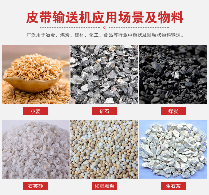 皮帶輸送機可用于煤炭、化工、建材、冶金、電力、輕工、糧食、港口、船舶等行業,在主要用于輸送散裝及成件物料,可以單臺輸送,也可與其他輸送設備配套使用,可以水平或傾斜輸送物料,適用于輸送堆積密度小于1.67/噸/立方米,易于掏取的粉狀、粒狀、小塊狀的低磨琢性物料及袋裝物料,如煤、碎石、砂、水泥、化肥、糧食等。被送物料溫度小于60℃。對于輸送有特殊要求的物料,如:高溫、具有酸、堿、油類物質或有機溶劑等成份的物料,需采用特殊的輸送帶。