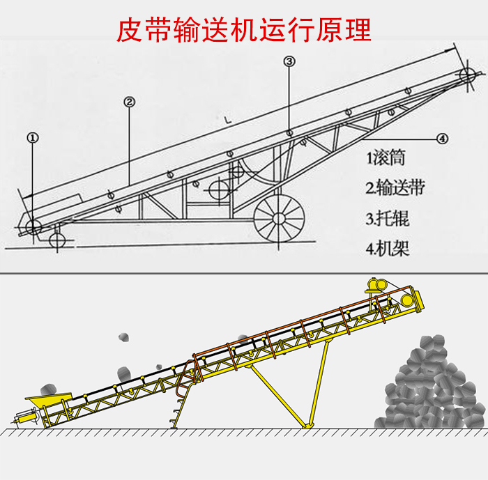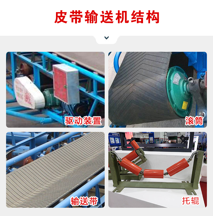 皮帶輸送機主要由輸送帶,托輥、滾筒、松緊裝置等部分組成。