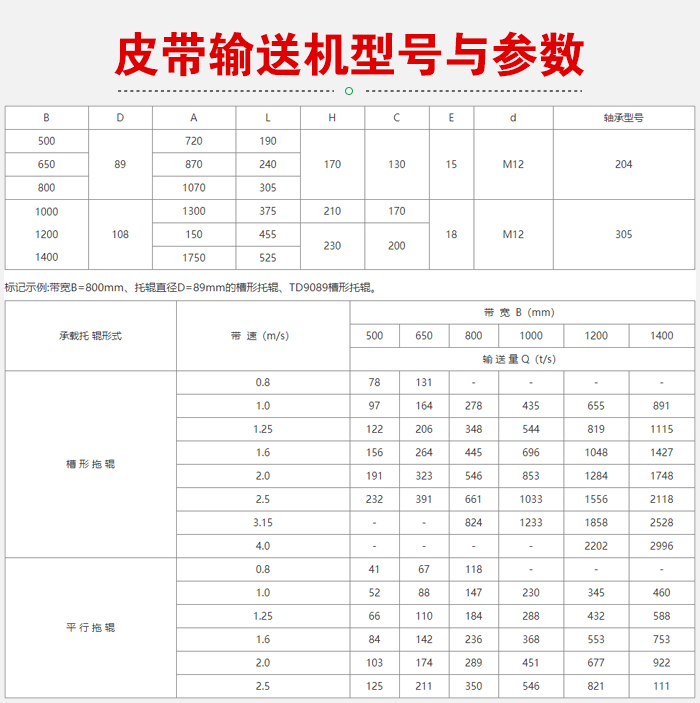 輸送量大小決定型號及電機功率的選擇,輸送量越大的皮帶輸送機,應選較高的帶速,型號也就越大。